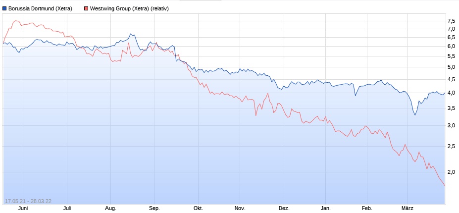 BVB Aktie könnte ausgehend vom 7.3.2022 (Tiefstkurse aufgrund Ukraine Krieg bei allen Indizes und bei der BVB Aktie) bis zur CL Reform 2024/25 dreistellig besser performen als DAX und co. Wenn irgendjemand hier ernsthaft meint, das wäre ja eh völlig selbstverstämndlich, dann dürfte derjenige keine E-Commerce Aktien im Depot haben. Westwing stand am 7.3. im Tief bei 14,70 hat also nicht in den vergangenen Monaten schlechter performt als andere, sondern hat die schlechtere Performance in allerkürzester Zeit nochmals verstärkt: Westwing hat seit den Tiefstkursen der Indizes am 7.3. 12% verloren, BVB 26% gewonnen.