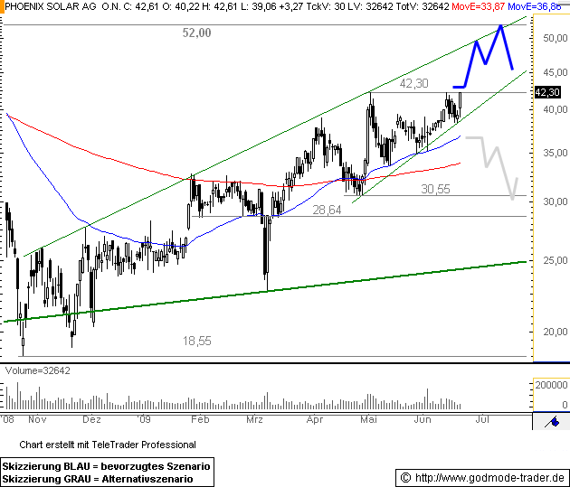 Rückblick: Die Phoenix Solar Aktie befindet sich seit dem Oktobertief bei 18,55 Euro in einer moderaten Aufwärtsbewegung. Dabei wurde das Jahreshoch bei 42,30 Euro Anfang Mai markiert und eine Zwischenkorrektur gestartet.
