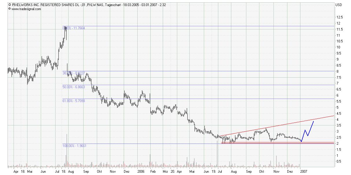 Kommentar: Trotz schwachen Zahlen des angeschlagenen Chip-Herstellers Pixelworks stehen die Analysten hinter dem Konzern. Der neuerliche Ausbruch über einen mittelfristigen Abwärtstrend zog interessierte Trader an Bord. Diese Woche wurde das Gap um 1,45 Dollar geschlossen. Es besteht nun die gute Möglichkeit, dass Pixelworks in den kommenden Wochen Richtung 2 Dollar und später sogar in die Gegend um 2,50 Dollar zieht. Nach unten sollte bei 1,30 $ ein relativ enger Stoploss gesetzt werden.
