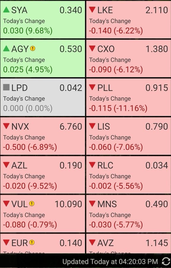 SRI§        Sipa Resources Ltd     0.049 -8% -8% 0%      $10,0­46,215.35