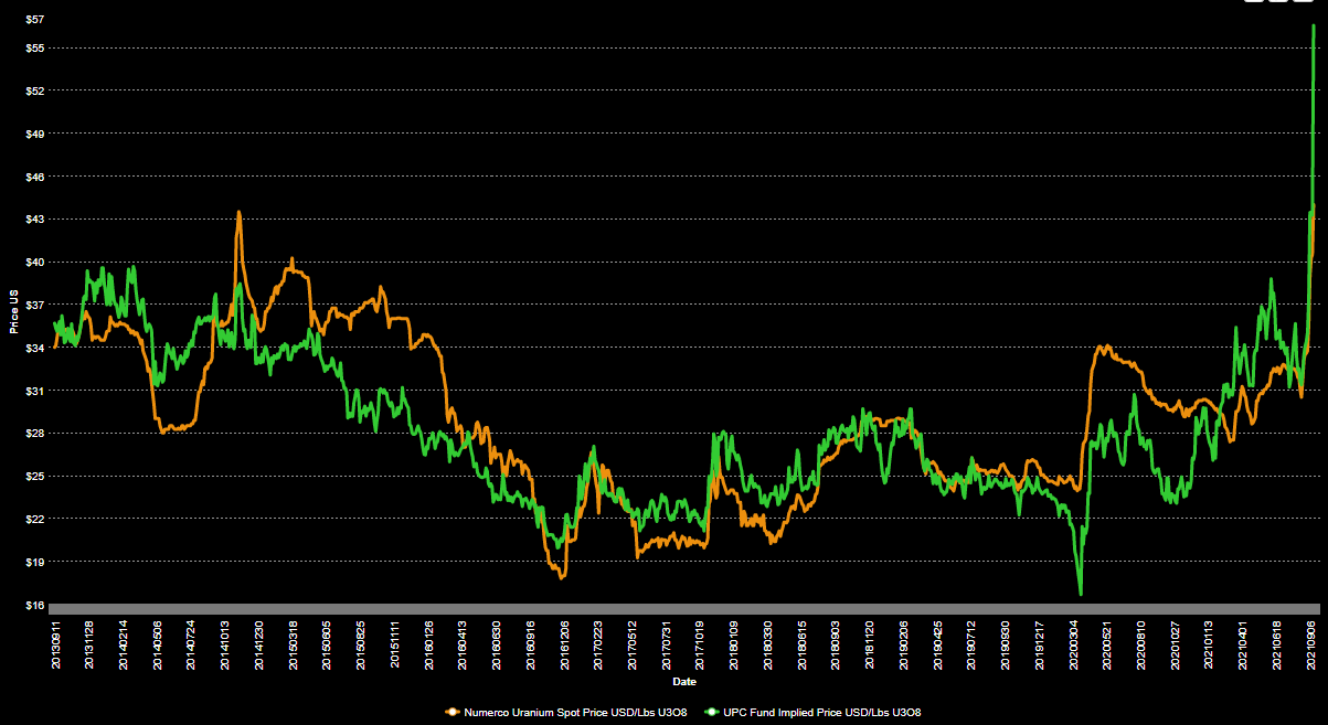SPUT impliziert einen aktuellen Preis von 57$/lb Spot U3O8 vs SPUT Implied U3O8 price. (UPC hist)