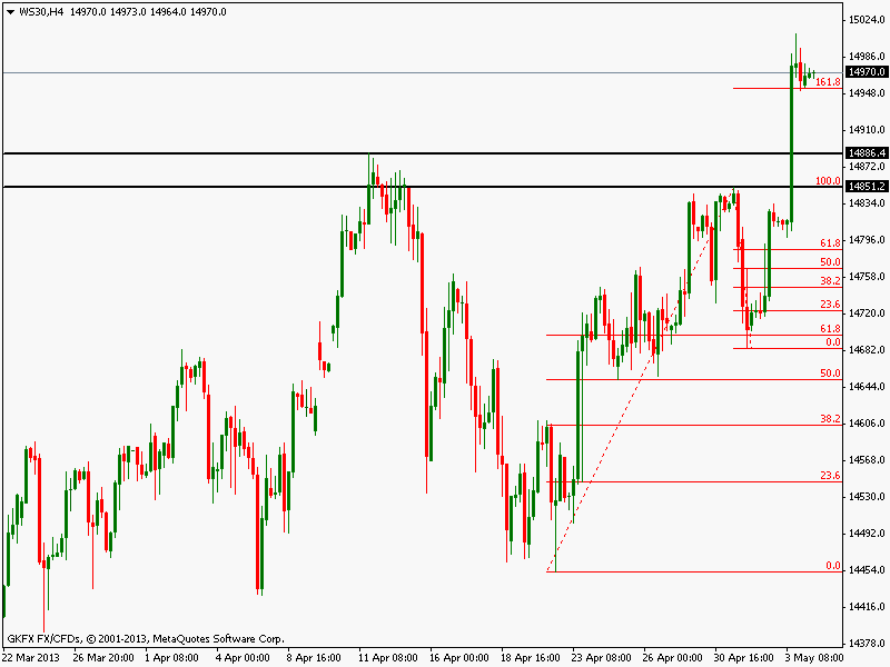 Der Dow Jones schoss mit einer unglaublichen Bewegung letzten Freitag zu einem neuen Jahreshoch. Das 161,8er Retracement wurde auch noch überschritten. Dieses dient jetzt als Unterstützung bei 14950. Darunter werden wir wohl das alte Hoch bei 14890 testen. Über 15010 wird ein weiteres Signal ausgelöst das uns bis zu 15100 Punkten bringen kann.