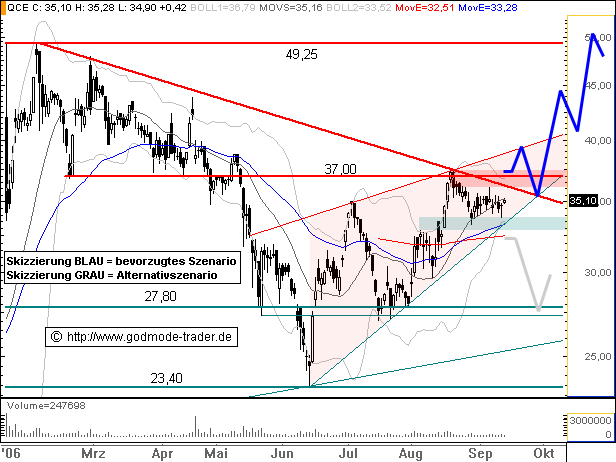 Rückblick: Die Q-CELLS Aktie markierte am 21.10.2005 das Allzeittief bei 19,37 Euro und startete nach moderater Aufwärtsbewegung Anfang 2006 eine dynamische Kursrallye bis auf 49,25 Euro. Dort kam es dann zunächst zu einer Seitwärtsbewegung oberhalb von 37,00 Euro, bevor im Mai eine deutlichere Abwärtskorrektur eingeleitet wurde. Im Juni rutschte die Aktie dann unter den wichtigen Unterstützungsbereich bei 27,80 Euro zurück, prallte aber an der Horizontalunterstützung bei 23,40 Euro wieder deutlich nach oben hin ab und stieg direkt wieder über 27,80 Euro an. Damit wurde ein Verkaufsignal rückgängig gemacht, was wieder Käufer in die Aktie lockte. Der Anstieg bis an die 37,00 Euro Marke war dann absehbar, aktuell korrigiert die Aktie knapp darunter seitwärts. Das Chartbild ist auf sämtlichen Zeitebenen bullisch zu werten.