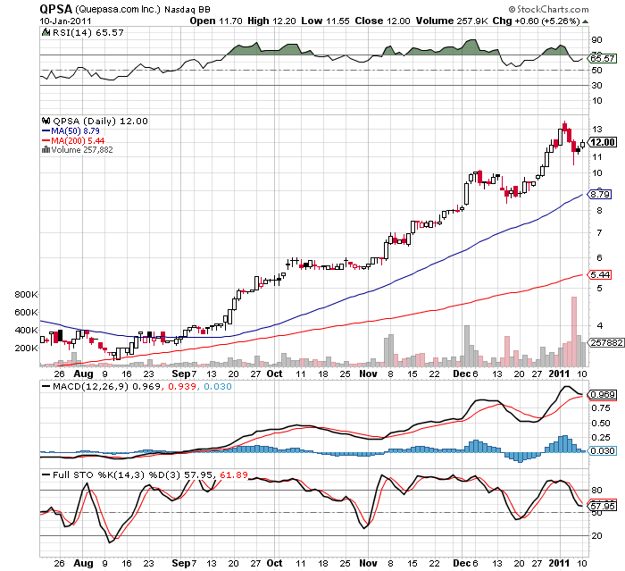 QuePasa.com (QPSA.OB): Social network, Quepasa.com, should see its valuation move considerably higher in 2011. Currently, the company is scaling its membership by 10% a month. In a certain sense, an investment in QPSA is a back-door play on Brazil’s economic growth, with most of its new members coming from this country. With indications building for an earlier-than-expected I.P.O. by Facebook in 2011, at some juncture we expect QPSA to go parabolic as investors seek secondary plays in the space. A move to $25 is a distinct possibility for a social network poised to scale to 50 million members by the end of next year. Such a move would still only value the shares at $12 a member.