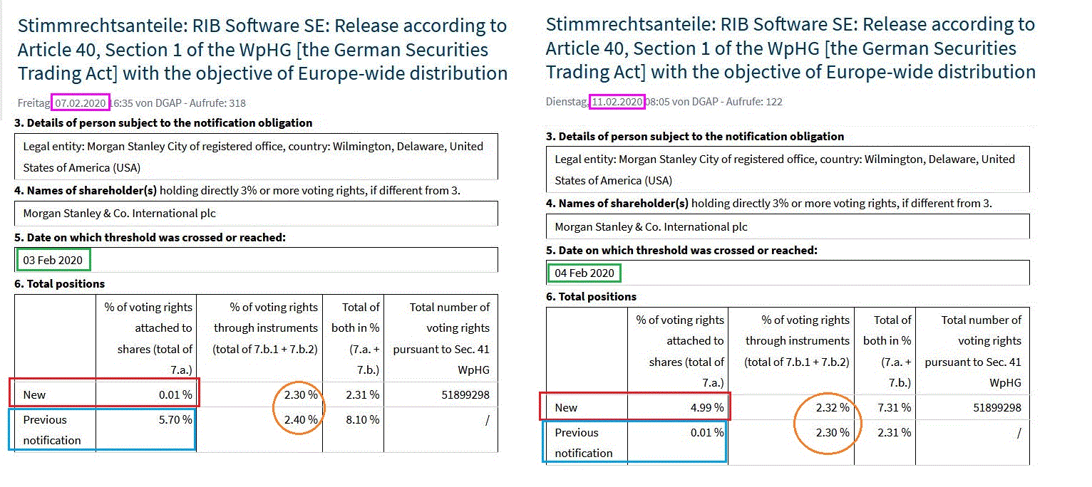 Der lustige wöchentliche Verschiebebahnhof bei Morgan Stanley geht also unverändert weiter. Letzten Freitag hatte man gemeldet schlagartig wäre der direkt gehaltene Aktienbestand von über 5% auf fast 0% abgebaut worden und heute meldet man plötzlich hätte man schlagartig den direkt gehaltenen Aktienbestand von fast 0% auf fast 5% wieder erhöht. Alles abgespielt vom 3. auf den 4. Februar. Der gehaltene Bestand an Instrumenten ( fast ausschließlich an Leerverkäufer verliehene Aktien) ist dagegen weitestgehend unverändert. Im regulären Börsenhandel wurden diese Transaktionen natürlich auch diesemal wieder nicht durchgeführt. Also schiebt man Pakete außerbörslich hin und her. Fragt sich nur in wessen Auftrag bzw. zu welchem Zweck. Bin mir fast sicher, daß man in den nächsten Wochen noch weitere solcher lustigen Wechselspiele von MS sehen dürfte, da dieses Spiel jetzt schon so lange läuft und dabei noch keine "Ermüdungserscheinungen" zu sehen sind.