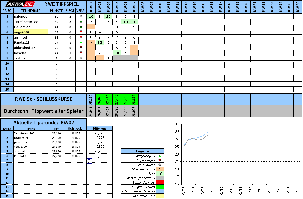 Auch RWE hat eine Wahnsinns-Preformance hingelegt und steht nun wieder auf einem beachtlichen Wert von 28,875 €. Damit ist sie eine weitere Woche in Folge gestiegen wie schön an der untigen Statistik zu sehen. Ich wünsche euch weiterhin viel Glück und Erfolg.