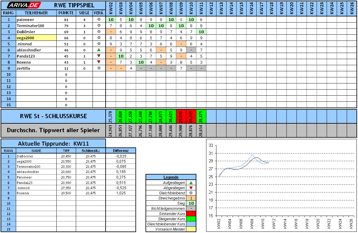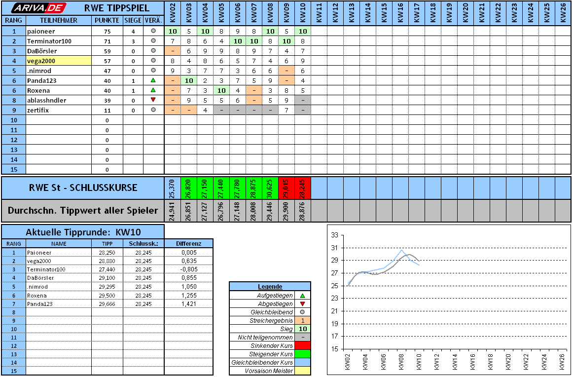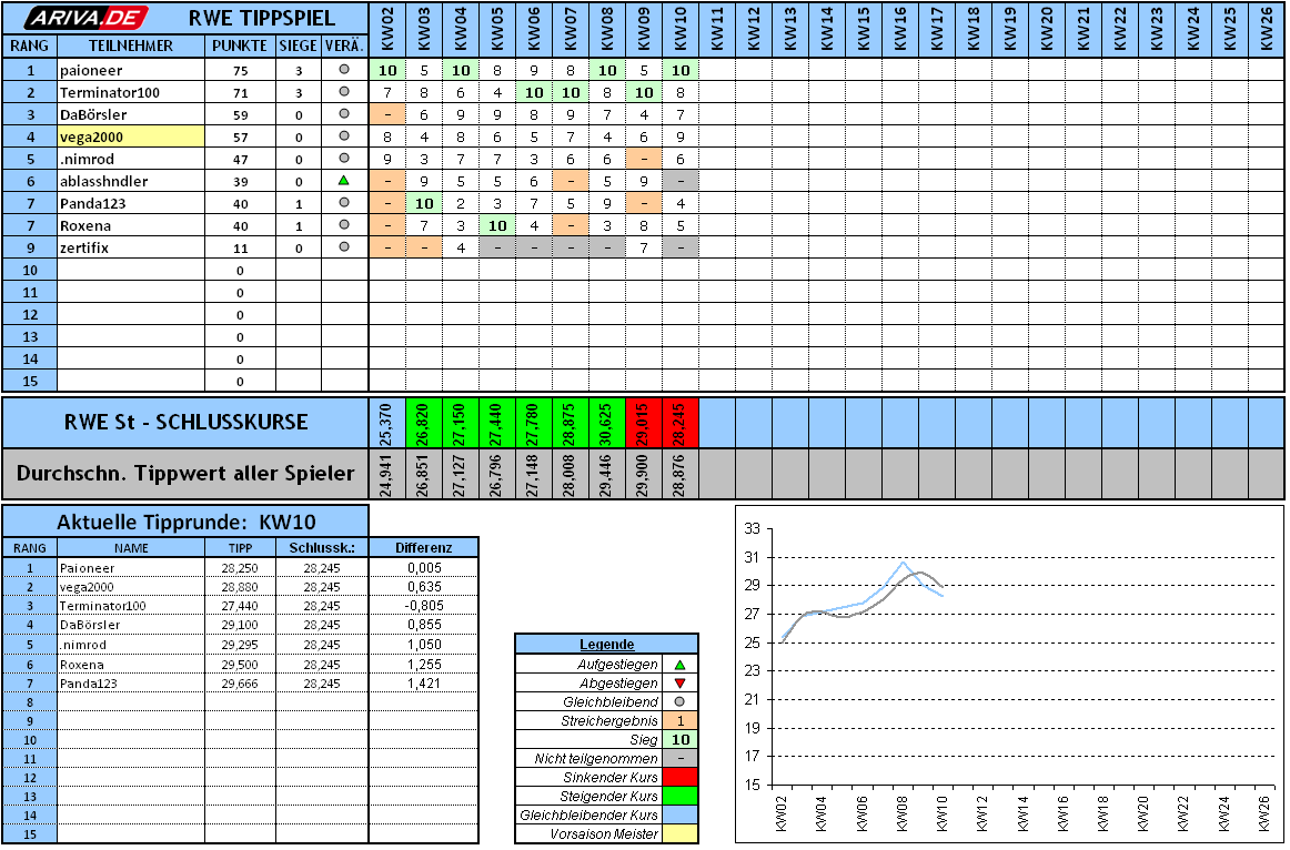 Traurig aber wahr, kursmäßig haben wir zum zweiten mal in Folge unter der Vorwoche geschlossen. RWE hat wieder saftig abgegeben. Paioneer hat wie schon so oft wieder den richtigen Riecher bewiesen und beinahe eine Punktlandung gemacht. Gratulation zum Wochensieg.