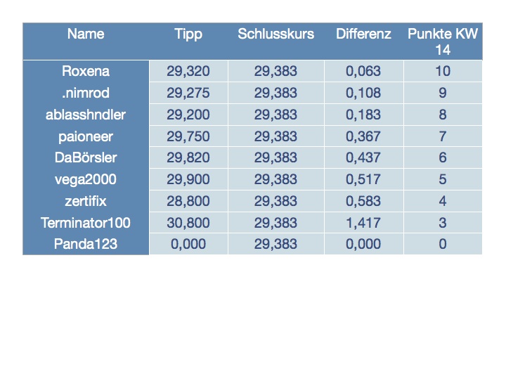 Am Freitag Abend waren Kurse zwischen 28,63 über 28,73 bishin zu 28,778 zu lesen (Xetra, Ariva-Seite & Frankfurt/M.)