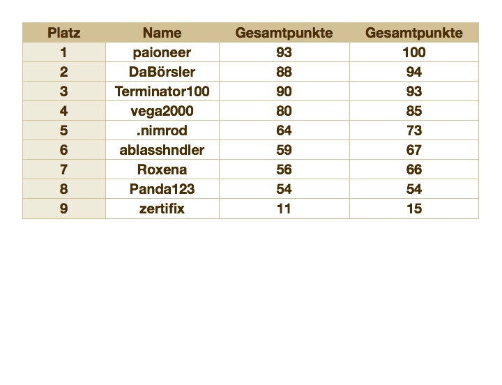 Ich nehme zur Auswertung immer, wie weiter oben schonmal beschrieben, diesen Kurs: