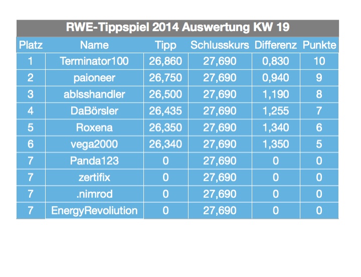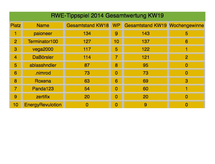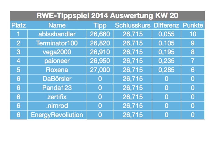 mehr gönne ich es diesmal jedoch ablass. das wäre der hammer gewesen, wenn er nach dem gestrigen tagesverlauf nicht doch gewonnen hätte. am heutigen tag hätte eigentlich jeder gewinnen können, daher gratuliere ich allen, zu wirklich guten tipps. bei dieser marktlage wirklich nicht einfach zu tippen und daher nicht genug zu loben, wie wir uns woche für woche schlagen, auch wenn wir manchmal total daneben liegen - so oft aber auch nicht ;=))