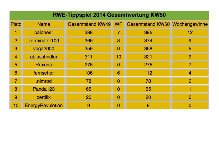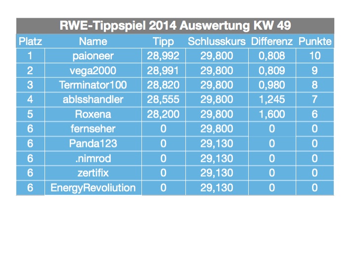Das Tippen hat Spaß gemacht, die Kursentwicklung von RWE weniger. Da meine Optionen nächste Woche wertlos verfallen und ich auch mich nicht mehr mit den Versorgern befassen möchte ist für mich ein Tippspiel auch in 2015 nicht interessant.