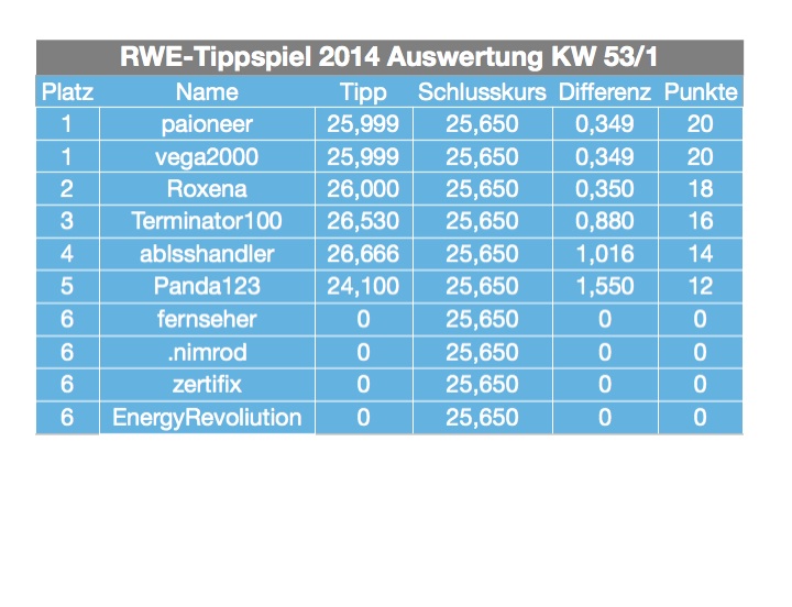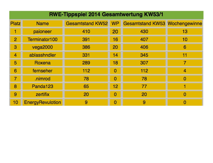 *Aus sportlicher Sicht wäre es so, wenn zwei auf Platz eins beim Wochentipp liegen (Tipp KW 53, paioneer & vega2000 beim ersten Tipp 25,999) dann entfällt der zweite Platz, -ich habe Euch hier mal ein Beispiel herausgesucht:
