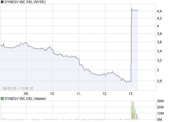 Die Aktie von Dynegy gewinnt aktuell 58,99 Prozent auf 4,42 Dollar. (13.08.2010/ac/n/a)