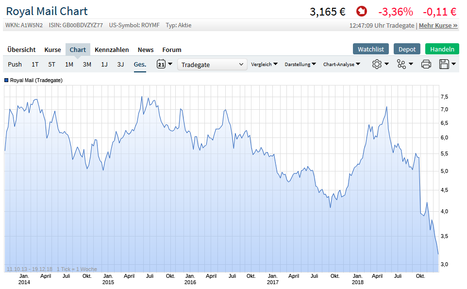 den Einbruch etwas zu arg. Deshalb werde ich hier weiter zukaufen und die Divi seh ich auch als sicher an. Die Brexit Unsicherheit und der weiter fallende Briefversand ist für mich hier längst engepreist. Das Ausscheiden aus dem FTSE 100 Index interssiert auch nicht wirklich, dann kaufen eben andere Fondsmanager hier zu die es vorher nicht durften. Gewinnwarnung ( weniger Briefe, weniger Einsparung von Kosten als beabsichtigt) hat wohl viele Anleger arg verschreckt. Anscheinend denken die Anleger....wenn das Wirtschaftswachstum schrumpft, werden die Konsumenten weniger ausgeben...weniger im Netz einkaufen...ergo, weniger Pakete? Aber wie die Historie aufzeigt kommt nach jedem Abschwung wieder eine Aufschwung. Blondlocke ist auch bald Geschichte, glaube nicht dass der nochmal als Presi 4 Jahre Schwachsinn verzapfen darf. Brexit ist dann auch durch. Gerade heut im Radio gehört dass die Zusteller extrem viel zu tun haben....Weihnachten naht und es wurde noch nie zuvor so viel im Netz bestellt wie dieses Jahr.