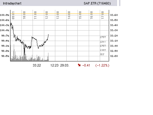 Die SAP-Aktie notiert derzeit in Frankfurt bei 33,55 Euro (-1,00 Prozent). (28.03.2007/ac/n/d)