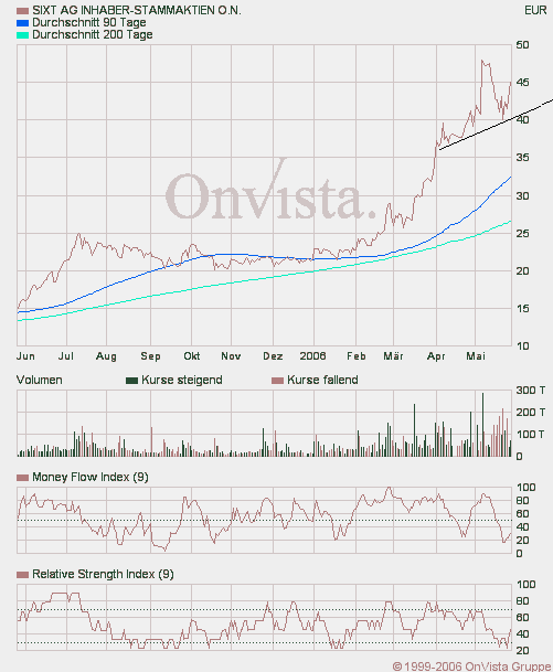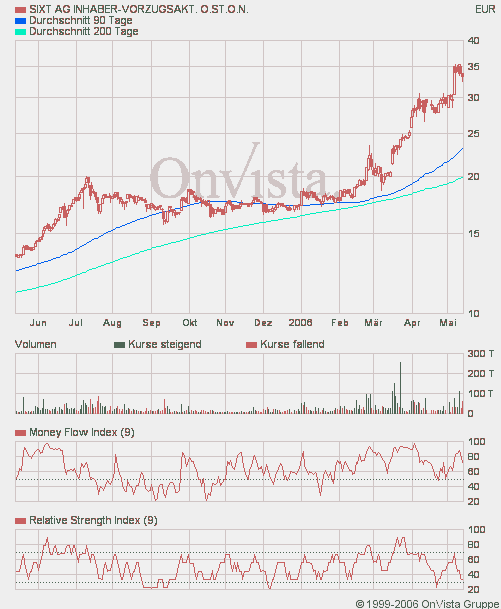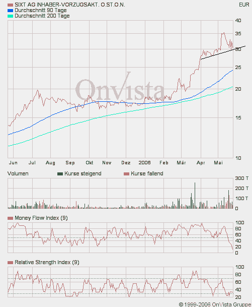mächtig krass was momentan so passiert. sixt hat durch ne starke eggenbewegung am freitag boden gut gemacht und steht momentan knapp 10% unter den höchstkursen. zeugt wirklich von massiver stärke. verkaufsdruck wird relativ schnell absorbiert. im tief lagen die vz´s bei 29 euro, welche man nun als ziemlich kräftige unterstützung ansehen kann. desweiteren positiv ist die immer noch "gute Verdauung" der Kapitalerhöhung. Immerhin wurden ja 78 Millionen eingenommen, da kann man eigentlich schon von mehr verkaufsdruck ausgehen.