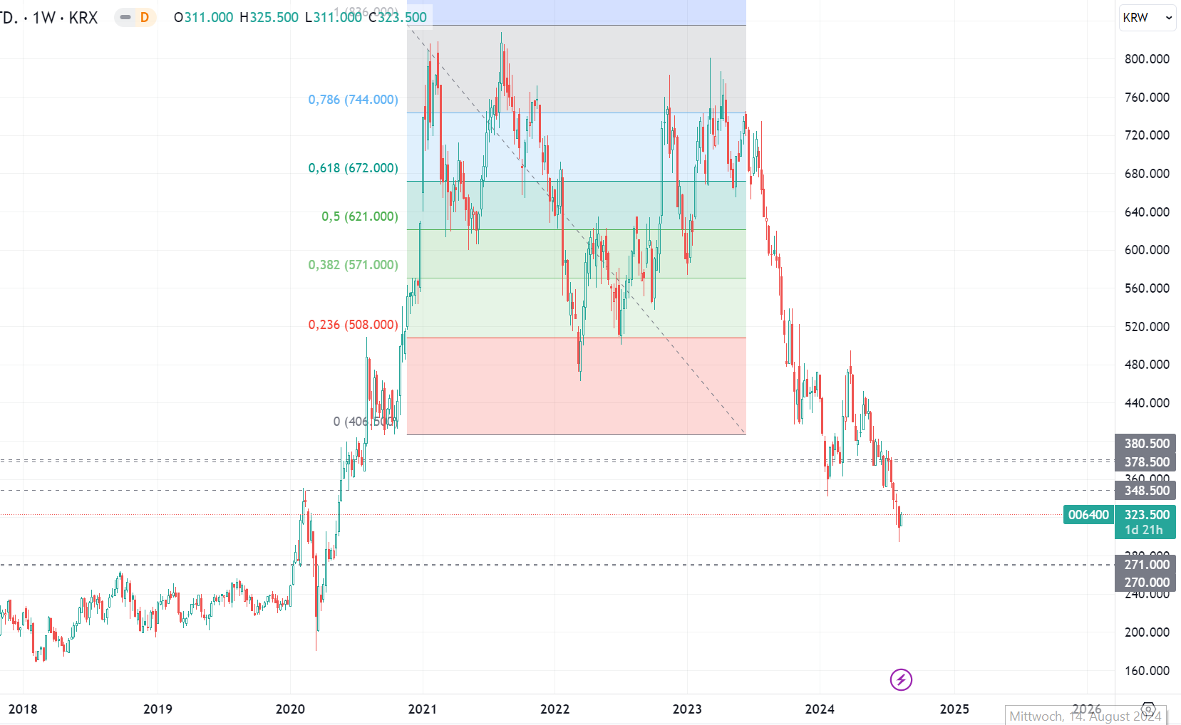 die wir außerhalb dieses Fadens diskutiert­ haben. Die Linie, das sieht man hier kaum, ist ein paralleler­ Kanal 270´ - 271´ KRW. In Abhängigke­it dessen, wie sich der Kurs im Verhältnis­ zu dieser Marke verhält, sollte man das erste mal beurteilen­ können, ob das für einen Boden herhalten kann.