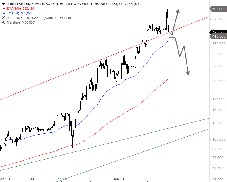 Kann ich mir bei bestem Willen nicht vorstellen, dass Secunet nächstes Jahr weniger an Sales haben wird, als dieses Jahr. Das Unternehmen ist eine Gelddruckmaschine; ich war dort als Dienstleister tätig und spreche aus Erfahrung. Charttechnisch hoffe ich, dass der EMA 200 bei 402 noch erreicht wird, dann würde ich eine Tranche nachkaufen.