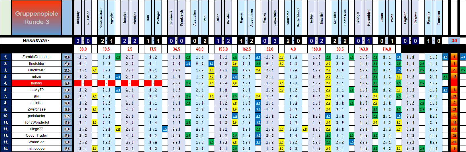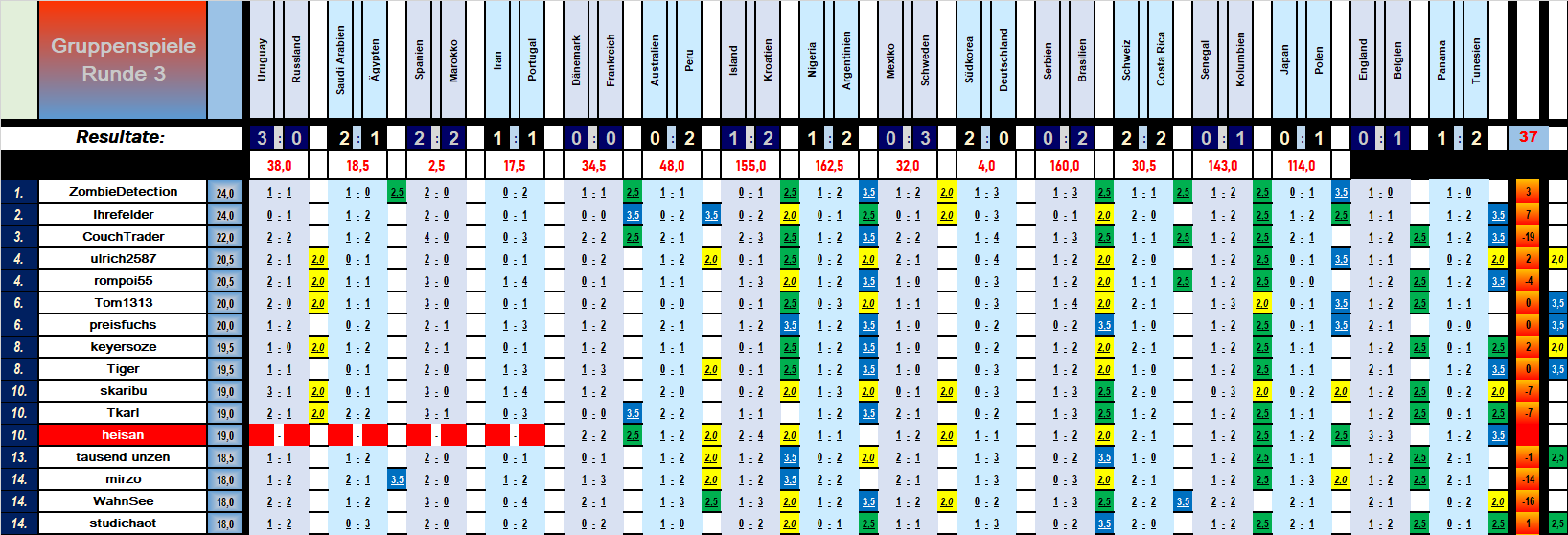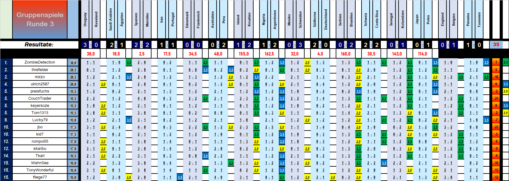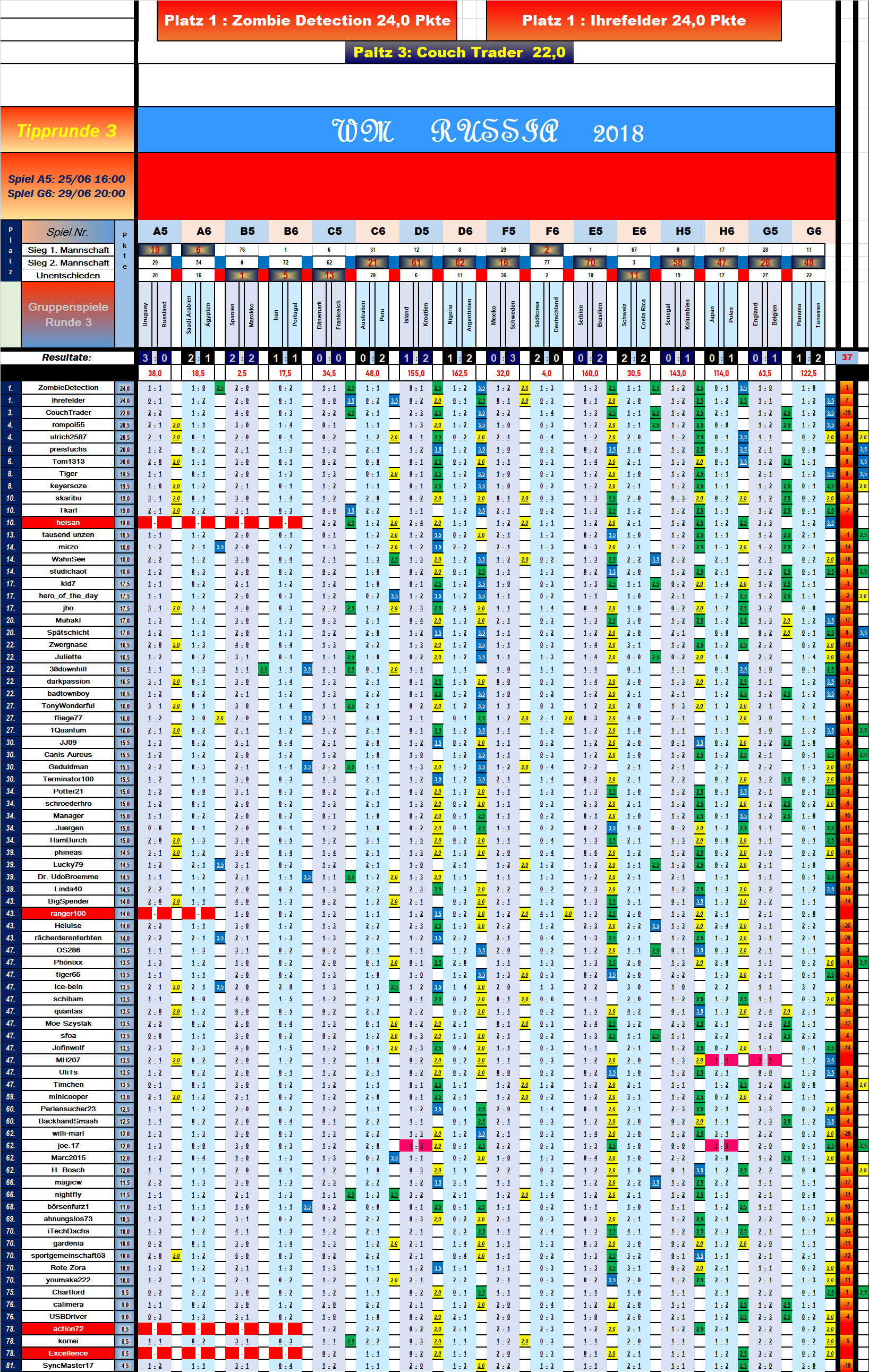 ZombieDetection hat sich denn doch noch von Ihrefelder einfangen lassen. Die zwischenzeitliche Führung von 8,0 Punkten hat am Ende nicht ganz gereicht um den alleinigen Sieg davonzutragen. Für den Hauptadmin unseres WM-Tippspiels 2018 freut es mich besonders.