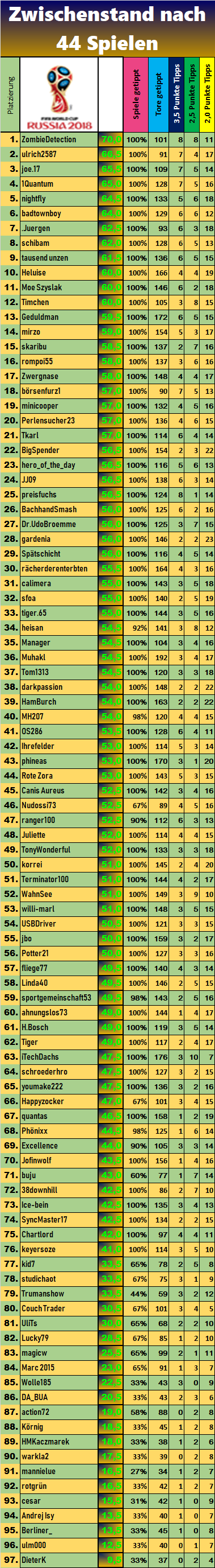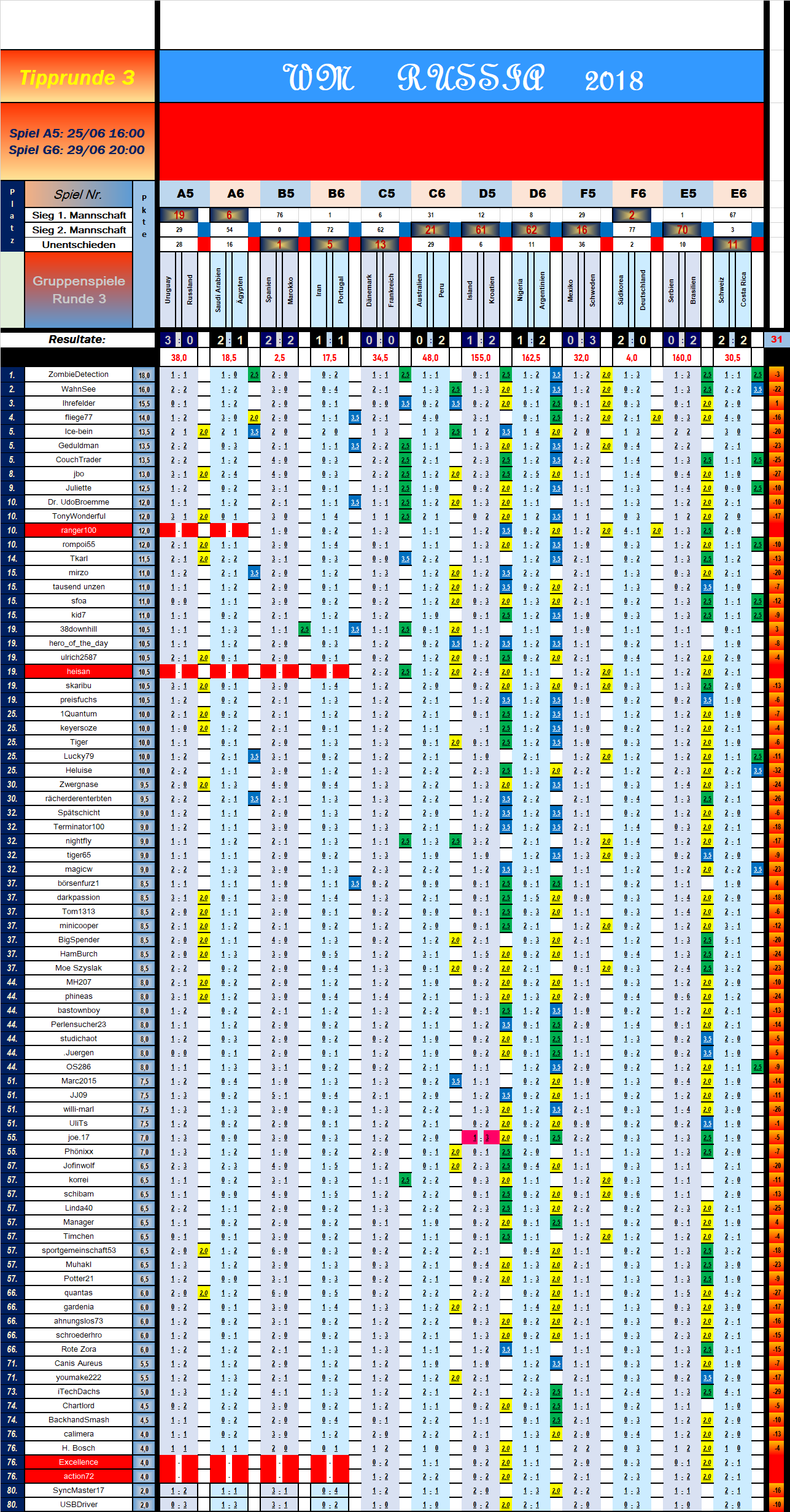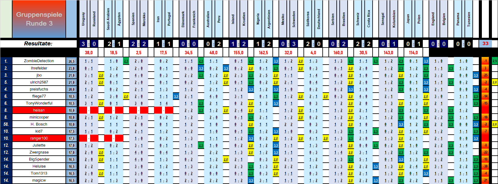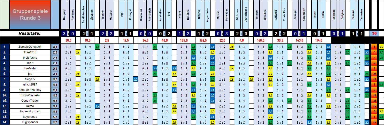 ZombieDetection hat sich denn doch noch von Ihrefelder einfangen lassen. Die zwischenzeitliche Führung von 8,0 Punkten hat am Ende nicht ganz gereicht um den alleinigen Sieg davonzutragen. Für den Hauptadmin unseres WM-Tippspiels 2018 freut es mich besonders.