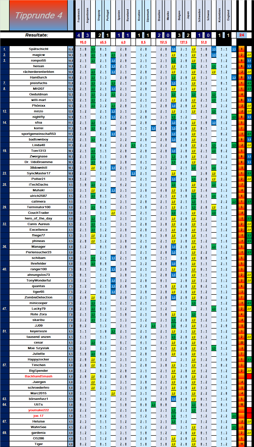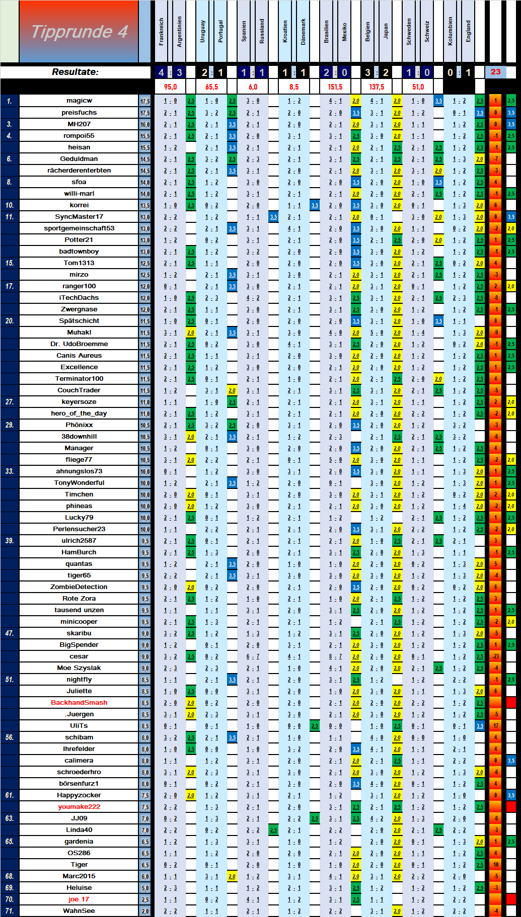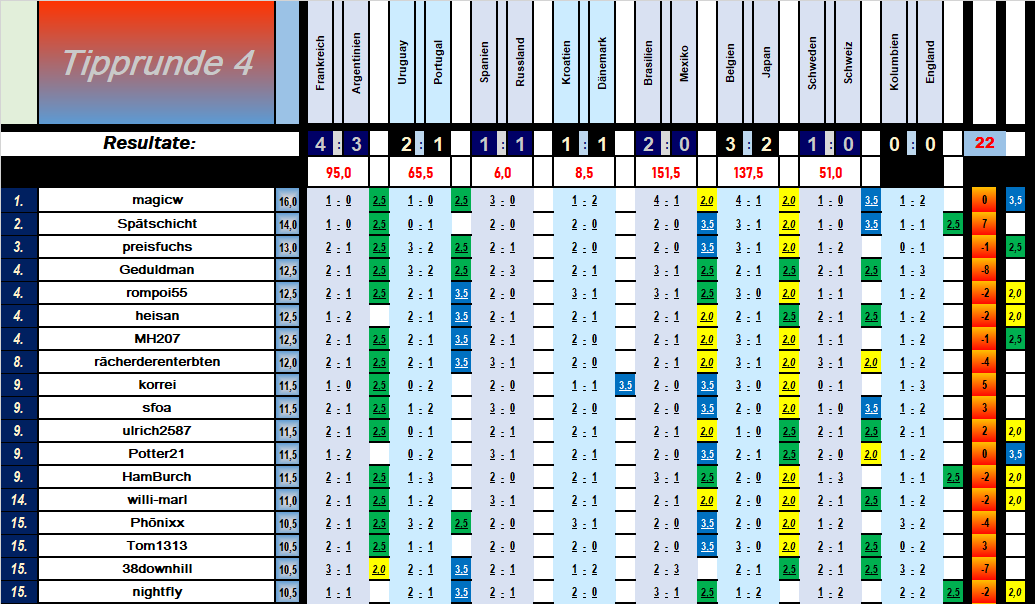 Zur Ausgangslage: Augenblicklich profitiert @-magicw zu 100% vom Zusatztipp und ist virtuell in Führung gegangen und ein @-Spätschicht mit seinem 1:1 Tipp rückt vorübergehend auf Platz 2 vor.