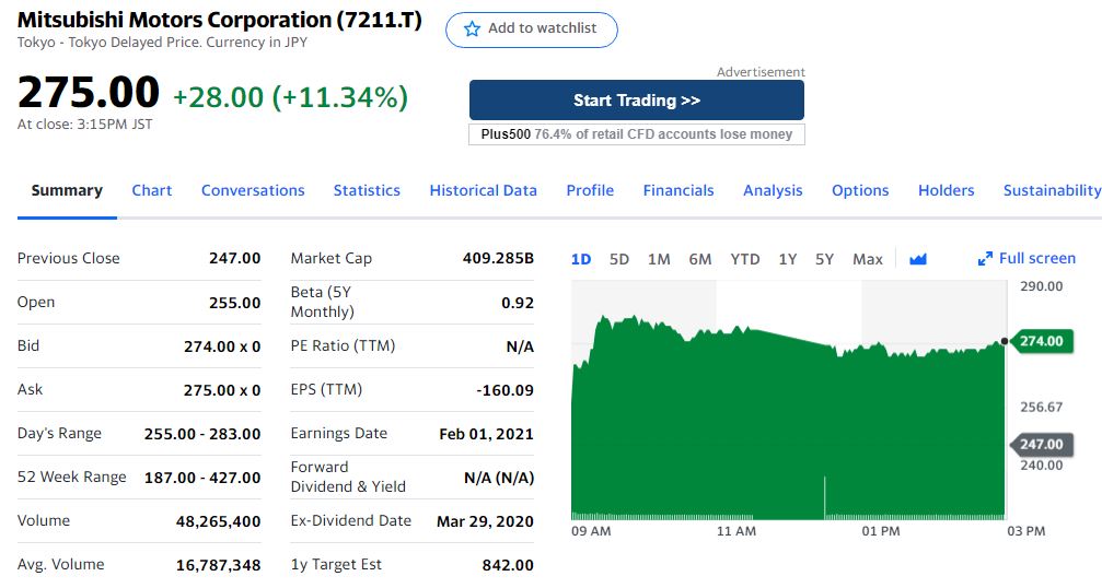 Ich bin bei 190 Yen rein und aktuell stehen wir bei 275 Yen. Gut informiert seid ihr bei Yahoo Finance, Ticker Symbol ist 7211.T