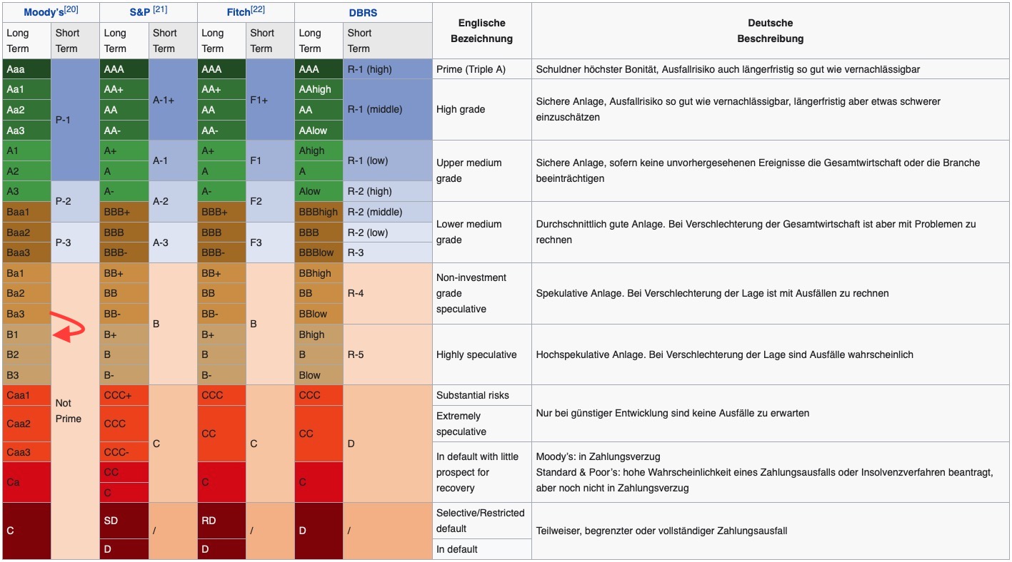 | Baa1 | Befriedigende Bonität / gegenwärtig stabile Lage, aber bei gesamtwirtschaftlichen Problemen erhöhtes Ausfallrisiko |