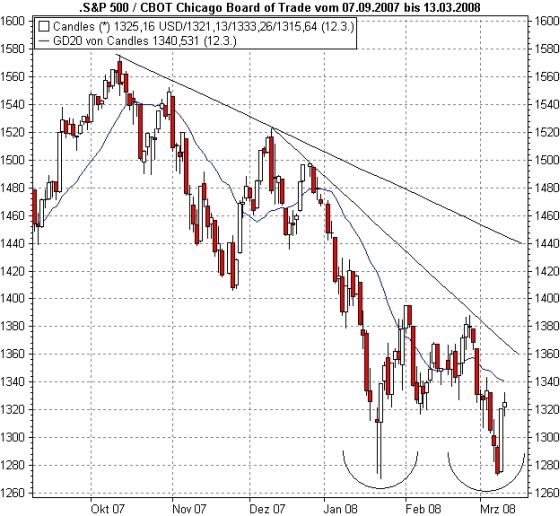 Wenn es also gelingt, die Aktienmärkte bis zu diesen drei Terminen oben zu halten, haben die Fonds eine Chance, das ansonsten verlorene Quartal noch einigermaßen hinzubiegen, und das einerseits mit dem Geld aus der Milliardenspritze und andererseits unter Ausnutzung des Verhaltens der „Stumpfen“, die dann möglicherweise zu Erfüllungsgehilfen werden. Was heißt: Wenn alles nach Plan klappt, bekommen wir bis Anfang April eine Rallye, die durchaus weit reichen kann. Wie Sie im Chart des S&P 500 sehen: