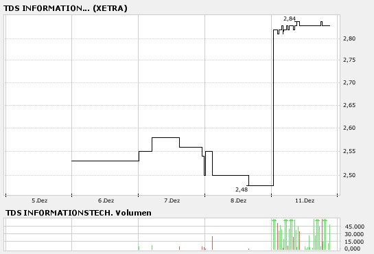 Denn der Kaufpreis liegt Flüsterschätzungen zufolge bei mindestens 3 Euro je Aktie. Obwohl die Firma auf diesem Niveau mit einem Marktwert von rund 87 Millionen Euro kein Schnäppchen mehr wäre, sei das Interesse der Wettbewerber auf Grund der guten Marktstellung von TDS im Bereich IT-Outscourcing groß, heißt es in Finanzkreisen.