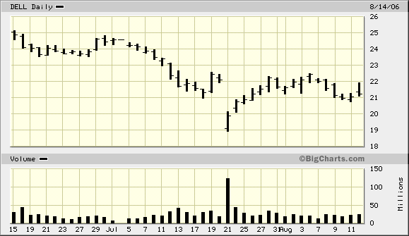Ich hab das am 21. Juli mit Dell durchexerziert (EK im Intel-Thread gepostet), als die Aktie nach der Gewinnwarnung auf 18,90 Dollar fiel (Vortag: 22 Dollar). Zwei Tage später war sie schon wieder über 21 Dollar (siehe Chart unten). Auch bei Dell wurde der "Ausverkauf" durch den drastischen Volumenanstieg "angezeigt". Deshalb ist es in der Charttechnik so wichtig, auch auf das Volumen zu achten (was hier in den Foren leider oft unterbleibt).