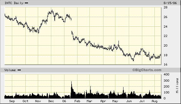 Für 12 Euro würde ich TUI unbesehen kaufen - da könnte sich im Langzeitchart ein Doppelboden abzeichnen. Jetzt bei 14 zögere ich noch, weil ich aus eigener schmerzlicher Erfahrung weiß, welch perfide Macht Shortseller haben, vor allem wenn sie zu einer Sammelattacke blasen wie jetzt bei TUI. Der Chart ist zurzeit im Niemandsland - Tendenz: fallend. Ich würde am liebsten erst bei einer Bodenbildung einsteigen. Ein solcher Boden zeigt sich zur Zeit z. B. im Intel-Chart (unten). Er ist auch fundamental gut unterlegt, da Intel gerade eine neue, sehr leistungsfähige Prozessor-Generation rausgebracht hat, die dem Erzrivalen AMD Marktanteile abjagen wird (Details: Intel-Thread).