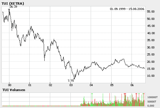 Natürlich finde ich TUI zurzeit billig, und ich finde auch die Analysen von Fuzzi und Dir dazu im Prinzip zutreffend. Wir handeln offenbar alle drei nach der - langfristig recht erfolgversprechenden - Prämisse, runtergeprügelte Substanzaktien günstig einzukaufen. In die gleiche Kerbe schlagen meine eigenen Turnaround-Empfehlungen, zu denen ich jeweils Threads eröffnet habe: Nokia (2004), Pfizer (2005), Intel (2004/2005), Microsoft (2006), und der Dollar (Anfang 2005).