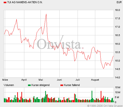Die TUI-Aktie notiert derzeit in Frankfurt bei 14,90 Euro (+1,36 Prozent). (28.08.2006/ac/n/d)