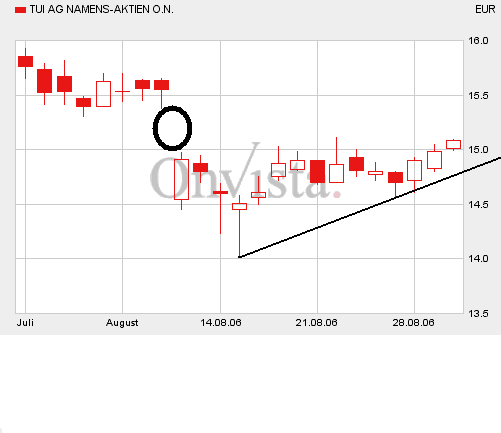 Hier wird hartnäckig auf eine Übernahme der TUI spekuliert, wenn man sich die Grafik anschaut, kann man davon nichts erkennen, es sieht mehr nach einer technischen Erholung aus.