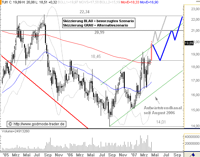 Rückblick: Die TUI Aktie fiel ab August 2005, nachdem sie am Widerstand bei 22,3 Euro gescheitert war, stark ab. Erst ein Jahr später markierte sie ein Tief bei 14,01 Euro. Dieses Tief war Ausgangspunkt einer Rallye, die noch immer anhält. Diese Bewegung lief bisher in einem Trendkanal ab. In der laufenden Woche etabliert sich die Aktie zum einen über dem wichtigen Widerstand bei 18,45 Euro. Dort verläuft der Sell Trigger, dessen Unterschreiten die deutliche 1jährige Abwärtsbewegung, ausgelöst hatte. Zudem attackiert die Aktie sogar die obere Begrenzung der Aufwärtsbewegung seit August, welche bei 19,59 Euro verläuft.