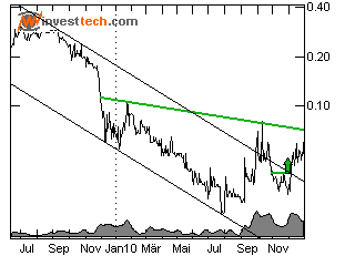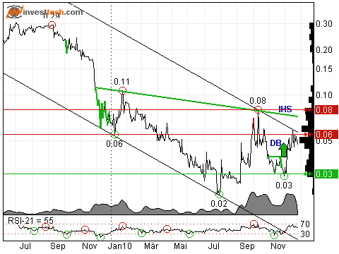 Es entwickelt sich eine mögliche Schulter-Kopf-Schulter-Umkehrformation. Ein etablierter Bruch über den Widerstand bei 0.07, vorzugsweise einhergehend mit einem steigenden Handelsvolumen, wird einen weiteren Kursanstieg anzeigen. Die Aktie hat den Widerstand bei ca. 0.06 euro marginal nach oben durchbrochen. Bei einem nachhaltigen Bruch ist eine weitere Aufwärtsbewegung zu erwarten.