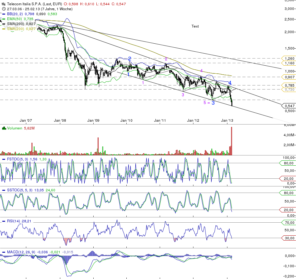 Die Gemengelage nachwievor sinkender Erträge im Telekom-Sektor und der Gefahr/Angst das Italien aus dem Euro austreten könnte, kann noch zu weit tieferen Ständen führen, wenn es dumm läuft (siehe Griechenland).