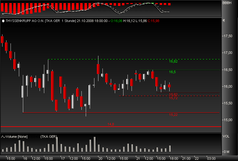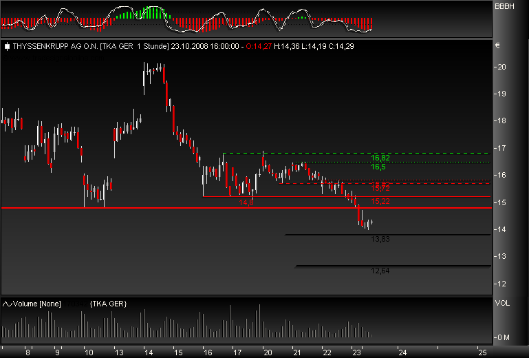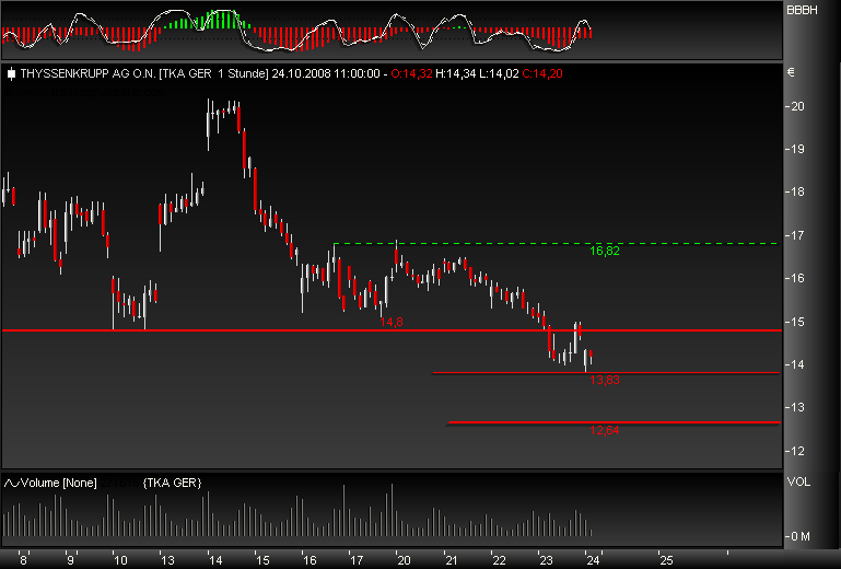 Die ThyssenKrupp-Aktie bietet nach Meinung der Experten von "Der Aktionärsbrief" auf Sicht von 6 Monaten eine Chance von 40%. (Ausgabe 43 vom 23.10.2008) (24.10.2008/ac/a/d)2008-10-24 08:47:32" Zitat ende