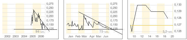 Laut Jahresprognose (Horoskop :-) ) der ARD vom 31.12.05 ist dieser Knick um 800 Punkte beim DAX vorhergesehen worden, oder umgekehrt die Abergläubigen Börsianer handeln genau danach und machen die Vorhersehung zur Realität. Das würde bedeuten das Ende Juli die Börse über die Höchststände vom Mai steigen wird und dann stagniert : Level DAX 6300-6500.