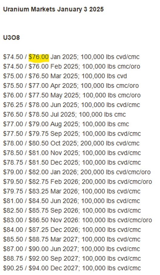 des physisch hinterlegten Yellow Cake. Spot klebt an 74, aber yellow cake läuft voraus.