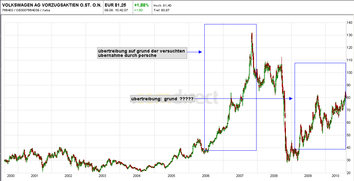 Der damalige 2008er exorbitante Kursverlauf war das Ergebnis einer genialen Falle für die Leerverkäufer**die haben schliesslich einen grossen Teil des 50% Pakets finanziert..mein Tipp..analysiert mal ganz unverbindlich die Porscheaktien..vielleicht ist dort das Kurspotential versteckt das man bei den VW Stämmen vermutet..alle Äusserungen basieren auf meiner ureigensten Einschätzung der momentanen Situation..jeder handelt auf eigene Verantwortung...zum traden ist die Aktie natürlich genausogut geeignet wie jede andere Aktie auch...
