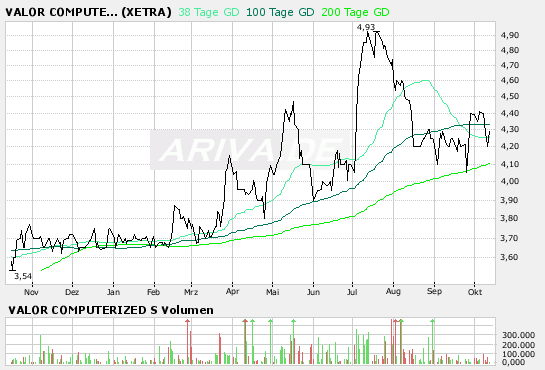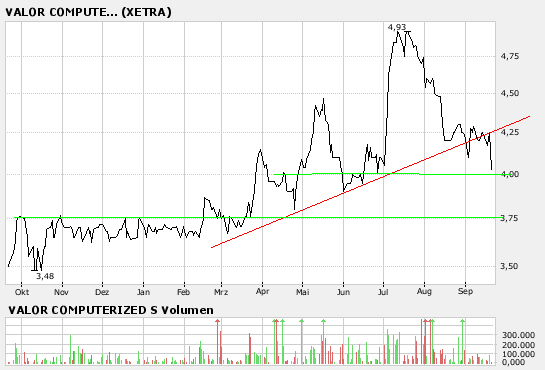 die Q3-Zahlen schon lange Schatten voraus? Am nächsten Montag soll es soweit sein, doch Valor hat sich noch nie an Termine gehalten, die Zahlen kamen oft eher als angekündigt. Vielleicht ist der jetzige Verkaufsdruck auch nur auf Grund des schlechten Marktumfeldes entstanden, warten wir die Zahlen ab.