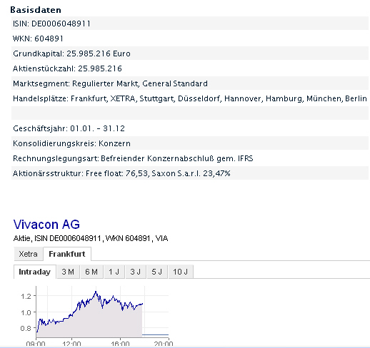 11. August 2010 geschlossen hat. In dieser Lock-up Vereinbarung verpflichtet sich Saxon keine Aktien börslich oder außerbörslich direkt oder indirekt zur Veräußerung anzubieten. Aufgrund der Vereinbarung ist eine Veräußerung der Aktien entweder vor dem Ablauf von drei Monaten ab dem 28. Oktober 2010 oder vor dem bewilligenden Beschluss der Frankfurter Wertpapierbörse über die Börsenzulassung der übrigen 4.111.480 Aktien nur mit vorheriger Zustimmung der Vivacon AG möglich, wobei das früher eintretende Ereignis maßgebend ist.