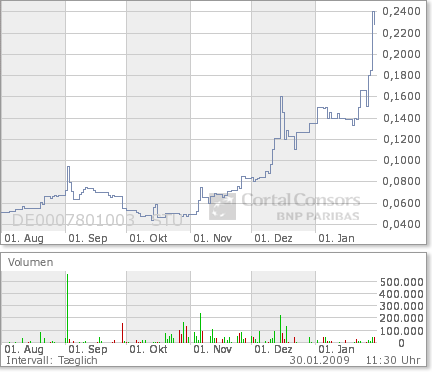 Gestern lag das Kursniveau bei 0,19 Euro. Im vergangenen Jahr war das Papier bis auf ein Rekordtief von 0,03 Euro gesackt, was zeigt, dass die Börse dem Unternehmen kaum noch Überlebenschancen gegeben hatte.