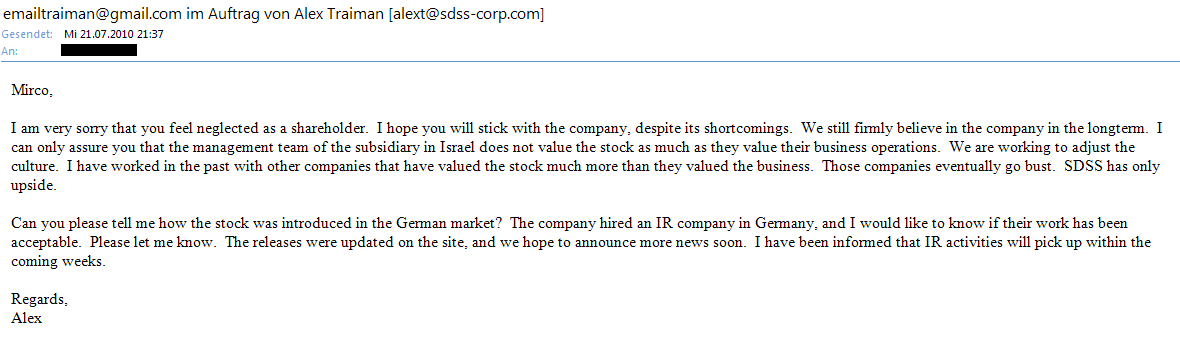 Was man zwischen den Zeilen aus der Mail entnehmen kann ist ein enormes Selbstbewusstsein. Allein zur Kapitalbeschaffung gibt es mehrere Möglichkeiten. So zum Beispiel eine Kapitalerhöhung oder Beschaffung am Kapitalmarkt oder Beteiligung auf Kapitalbasis oder ein JV oder Risikokapitalgeber. Mehr fällt mir gerade nicht ein, aber was alle wollen wenn sie in ein Unternehmen Kapital stecken sind ein erfolgversprechendes Geschäftsmodell mit Produkten die am Markt, in diesem Fall Sicherheitstechnik, gefragt sind. Nun kommt das oben beschriebene Selbstbewusstsein ins Spiel, es klingt geradezu so als könnte SDSS sich aussuchen von wen oder wie sie sich das Kapital beschaffen wollen.