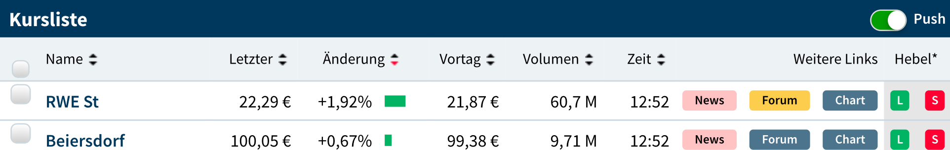 Am besten wäre, wie in der „fehlerfreien“ Vorversion die Buttons wieder in der Zeile direkt darzustellen- wie z. Zt. auch in den Kurslisten der Indizes gegeben.