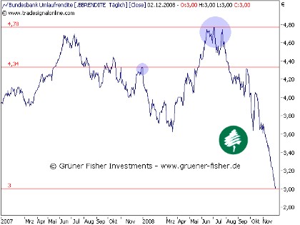 Die deutsche Umlaufrendite hat heute mit glatt 3% fast ihr Rekordtief wieder eingestellt. 10-jährige US-Staatsanleihen rentieren bereits mit rekordtiefen 2,70%. Selbst 30-jährige US-Papiere rentieren nur mit 3,25%.