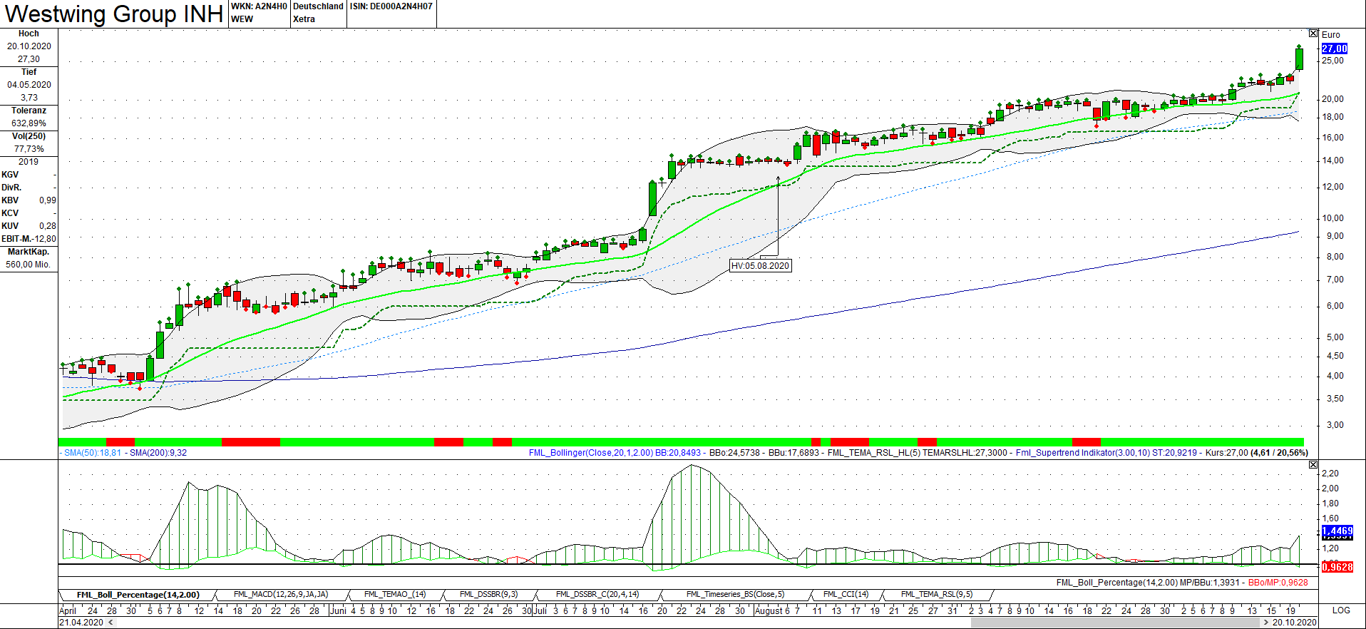 aus Bollinger Band raus - zu stark überkauft finde ich . Also Richtung € 26 - erste Unterstützung