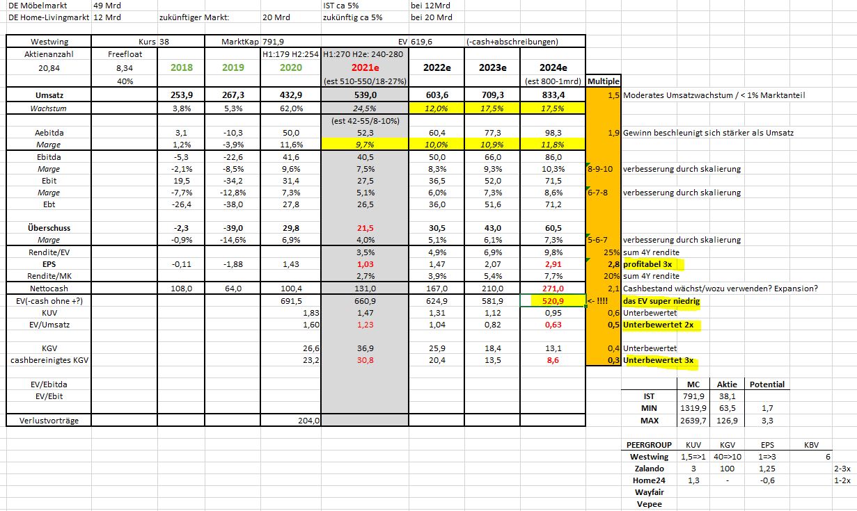 Es kann gut sein, dass Home24 zwischendrin mal stärker wächst (wobei dort zuletzt der Kundenzuwachs auch sehr niedrig in Q2 war, was aber am Basiseffekt des Vorjahresquartals liegt), und es kann auch immer mal ne Übernahme oder Kooperation bei anderen Unternehmen geben, die das dortige Wachstum unterstützen. Aber sowas lässt sich ja wie bei Zooplus nicht vorausahnen. Wer weiß, vielleicht wird auch bei Westwing hinter den Kulissen verhandelt. Geh ich aber nicht davon aus, zumal ich viel lieber in 18-24 Monaten einen Kursverdoppler hätte als kurzfristig 35%. ... Aktuell gibt es halt den psychologischen Effekt, dass jedermann den hohen Basiseffekt kennt und daher kurzfristig mit schlechteren Zahlen für 2-4 Quartale rechnet. Aber wie gesagt, damit rechnet doch eh Jeder. Wieso sollte also ausgerechnet der Westwing-Aktienkurs nochmal negativ betroffen sein? ... Fundamental könnten wir fües Jahr 2024 auf einen EV/FreeCashflow von 7 kommen, selbst wenn ich nur 15% Wachstum die nächsten drei Jahre unterstelle. Das ist doch komplett lächerlich im Vergleich zu diversen anderen ECommerce-Aktien und auch rein grundsätzlich.
