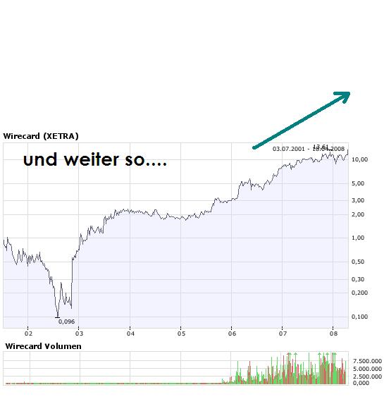 ich denke € 14, die wir fast erreicht haben,sind nur eine Durchgangsstation. Wirecard wächst weiter stark und das mit steigenden Margen. Da solte es also weiter zügig aufwärts gehen. Wenn der Gesamtmarkt noch mitspielt sehen wir bald die.....